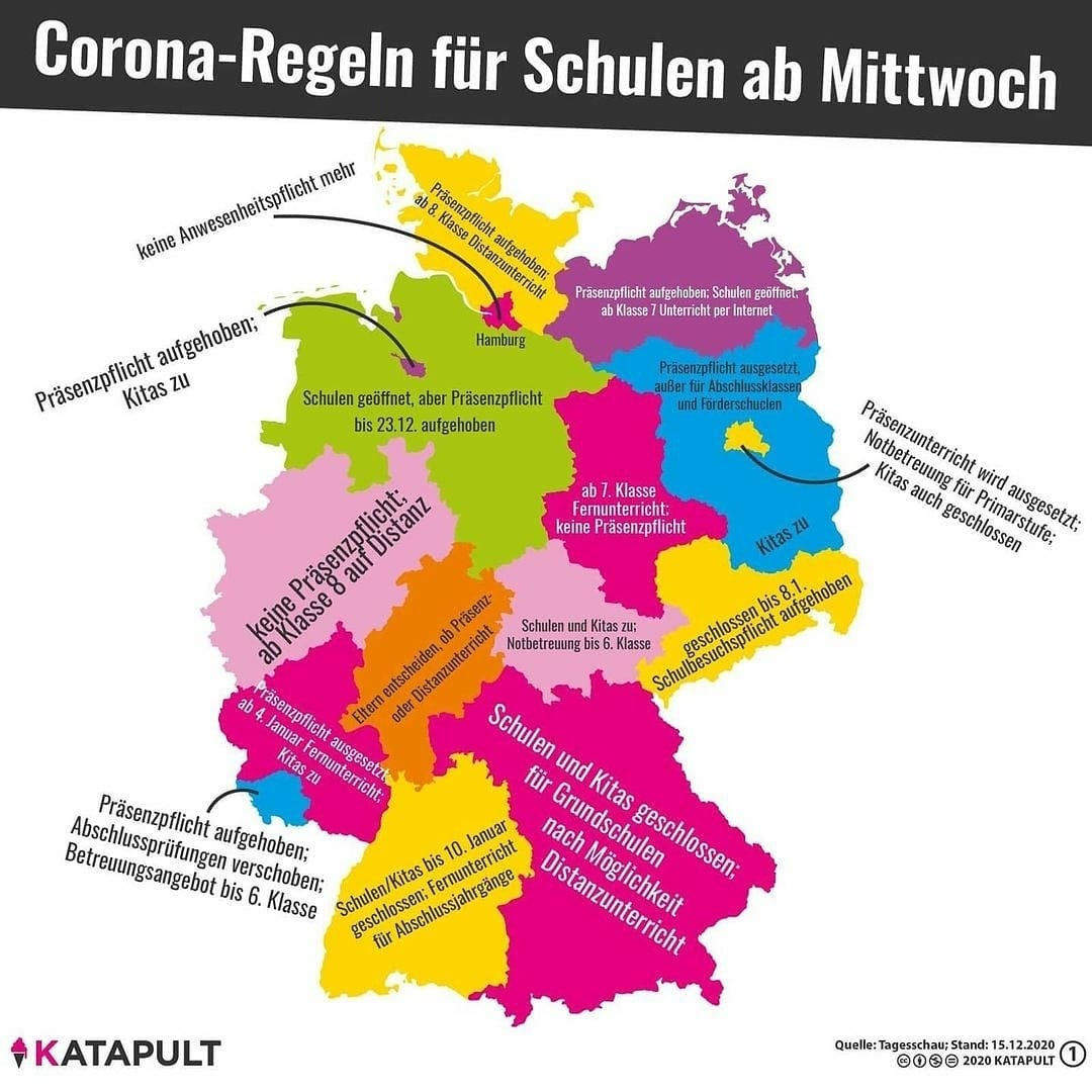 Chiusi i negozi tranne i supermercati, gli alimentari, le farmacie e poco altro. In alcune città è stato anche introdotto un coprifuoco notturno, fra le 21 e le 5 di mattina. Limitato a 5 il numero massimo di persone che si possono incontrare in casa fra il 24 e il 26 dicembre, esclusi i bambini sotto i 14 anni. Scuole e asili sono in linea di principio chiusi e le vacanze natalizie anticipate, ma ci sono alcune differenze da Land a Land, come mostra questa infografica realizzata dal magazine Katapult.