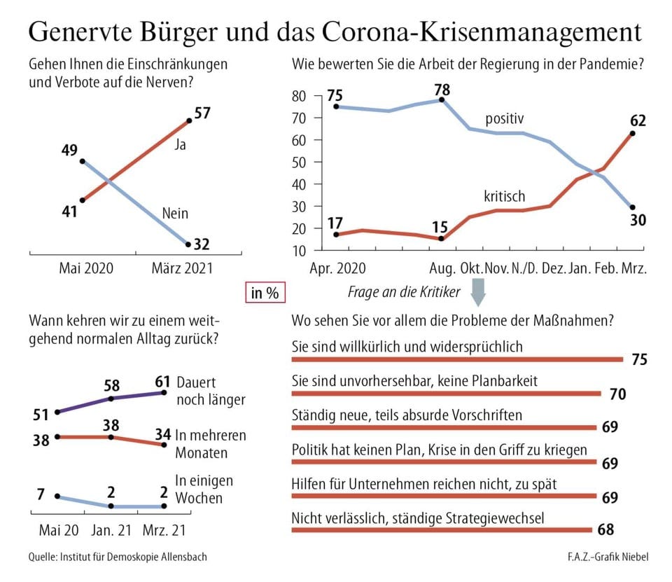 Il caos delle riaperture e delle chiusure, il numero di contagi ormai in costante aumento, la campagna vaccinale che continua a procedere con una lentezza estenuante - meno di 300.000 somministrazioni al giorno, con milioni di dosi che rimangono sugli scaffali - contribuiscono a esasperare i tedeschi, sempre più insofferenti rispetto alle restrizioni. Anche il giudizio sulla gestione della pandemia si è praticamente rovesciato: come mostra questo grafico elaborato dall’istituto demoscopico Allensbach da febbraio i valori si sono invertiti, con le valutazioni critiche ampiamente superiori rispetto a quelle positive.